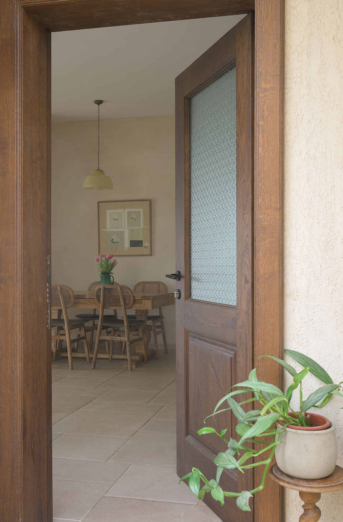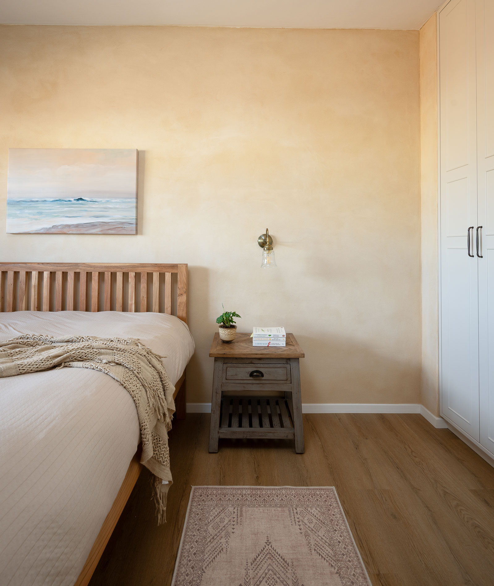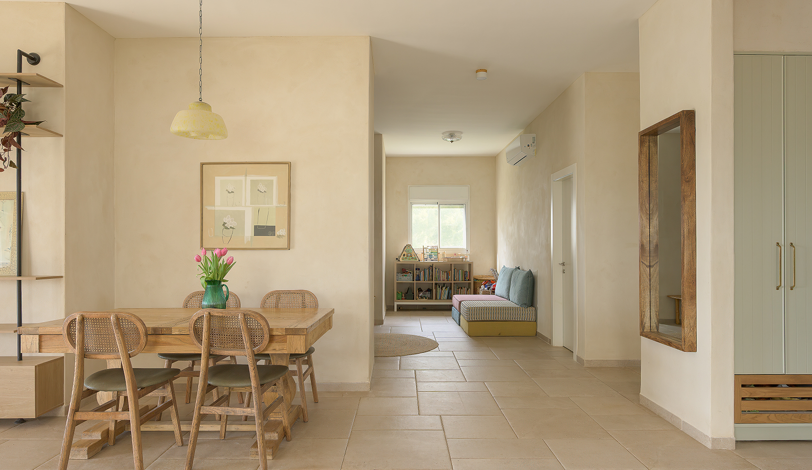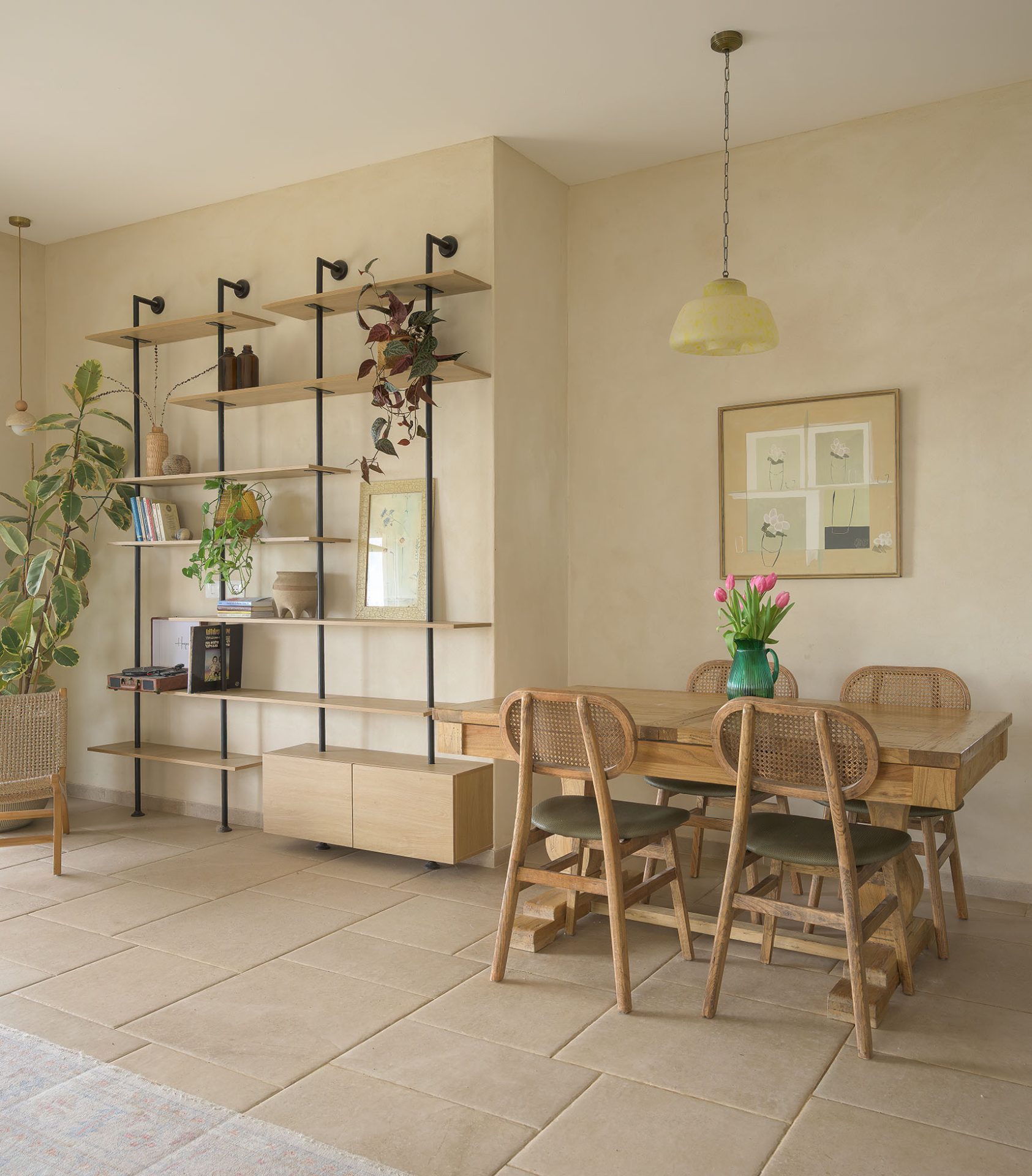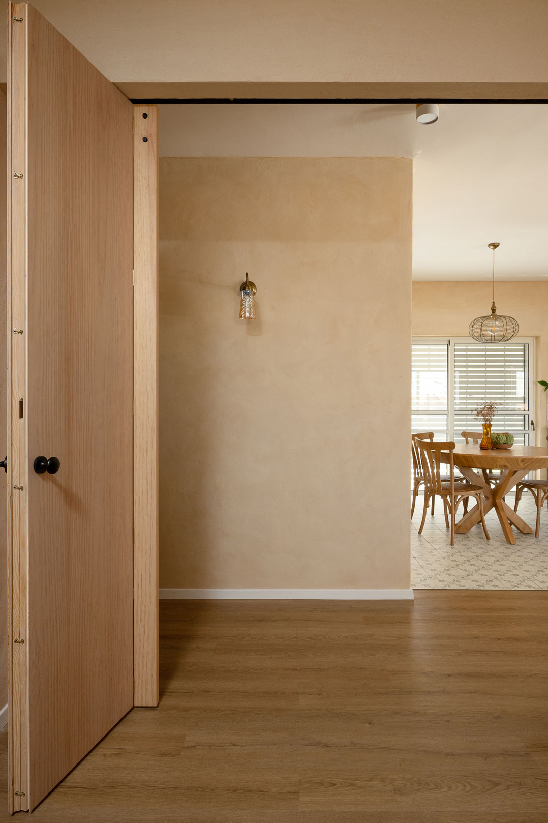 טיח מנראלי, נגיעות עץ חמות ופרופורציות מאוזנות יוצרים חלל שנוכח בשקט בלי להעמיס.