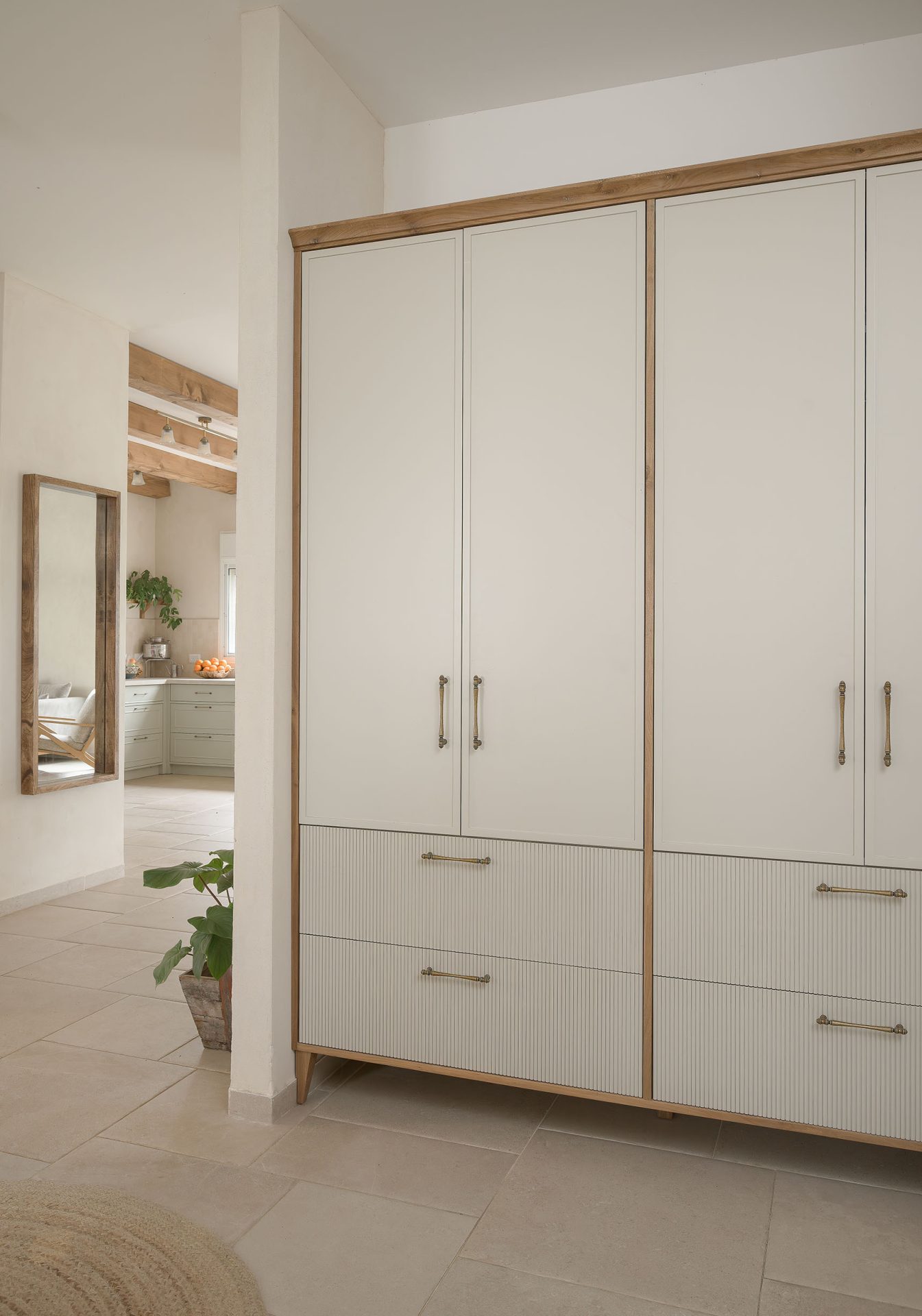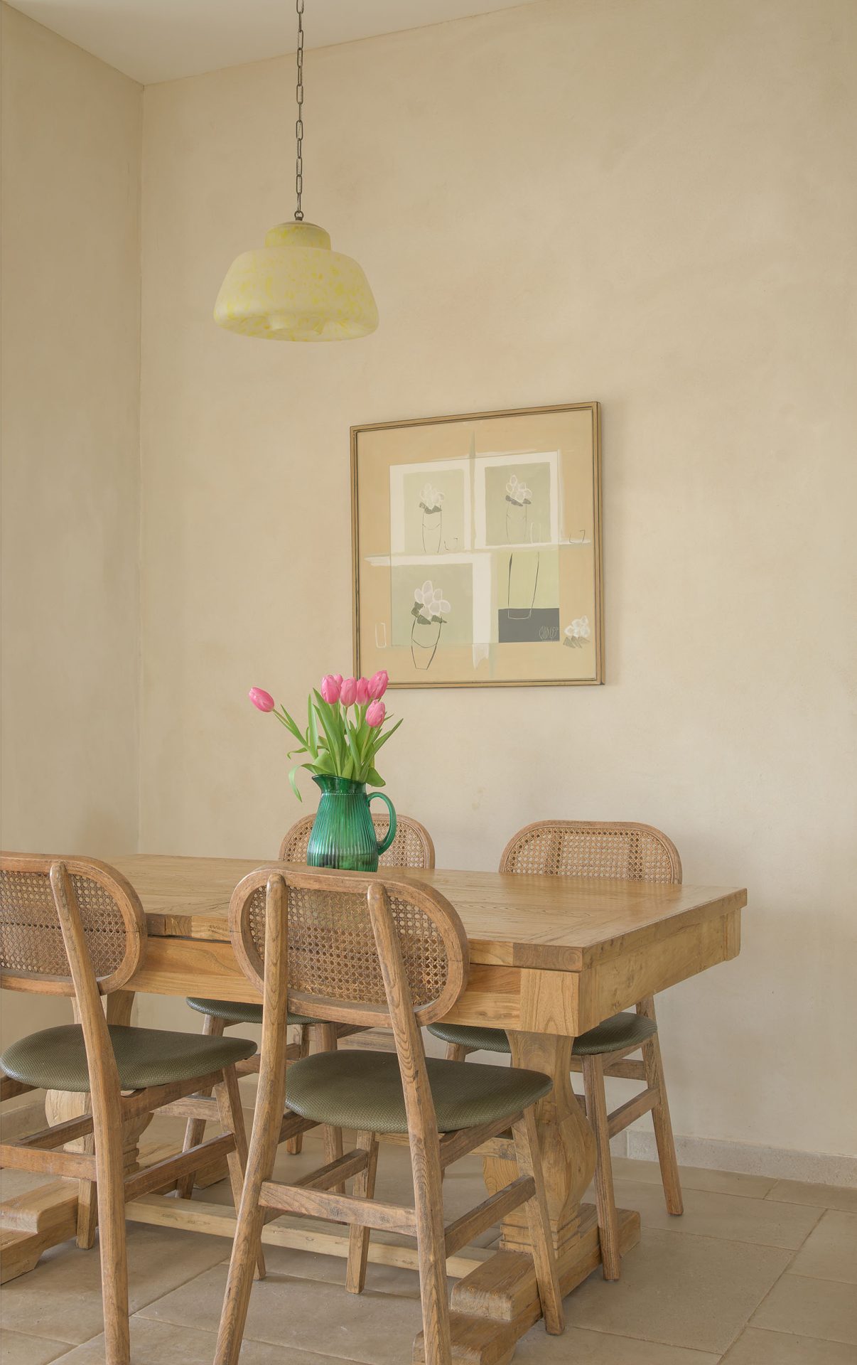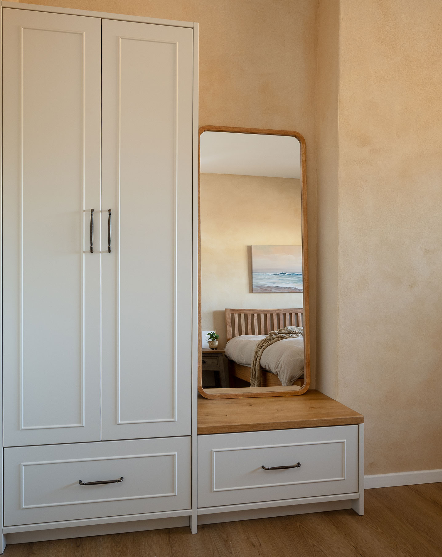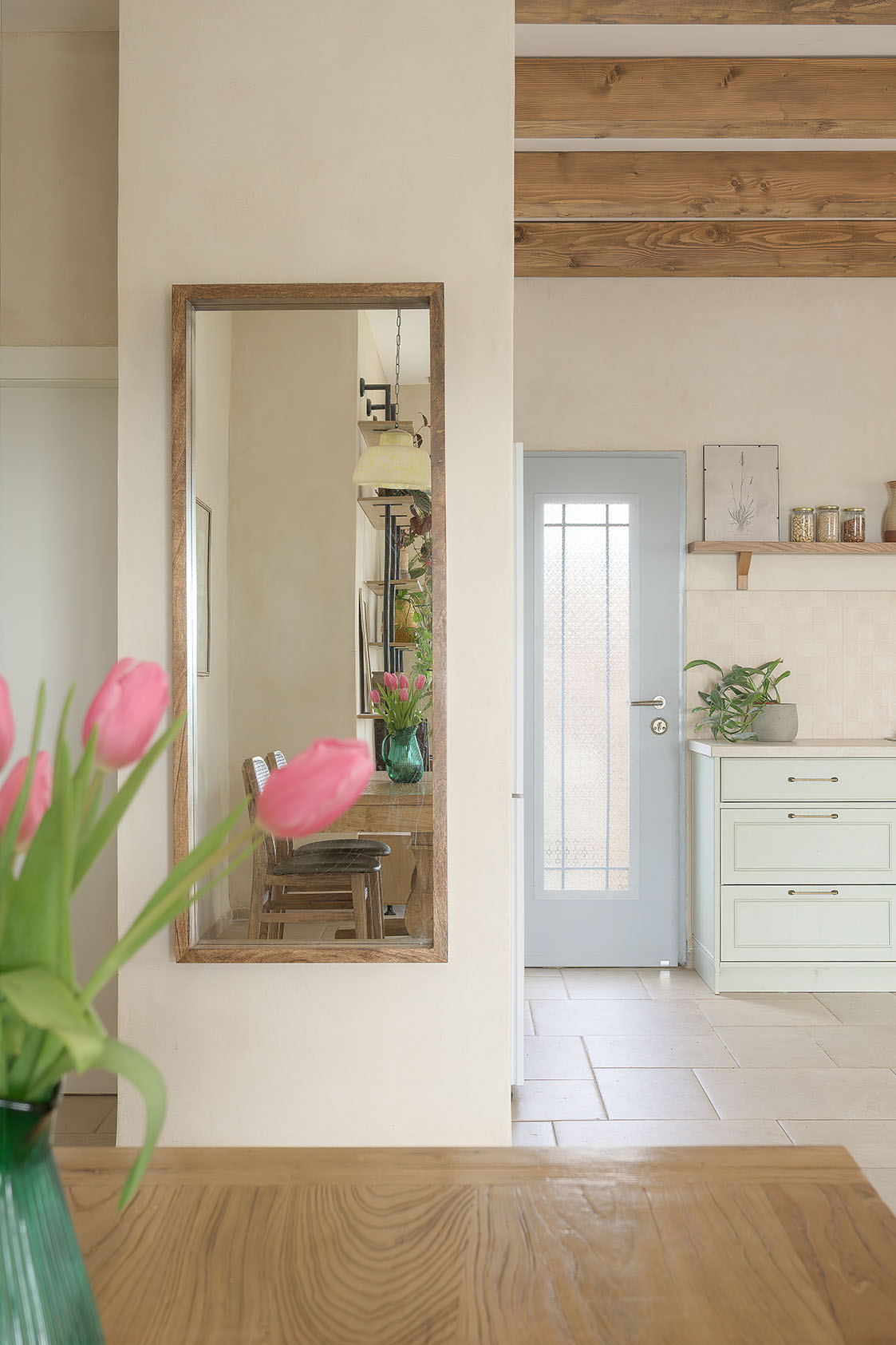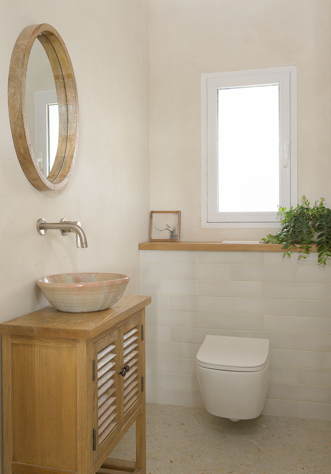 טיח מנראלי, נגיעות עץ חמות ופרופורציות מאוזנות יוצרים חלל שנוכח בשקט בלי להעמיס.