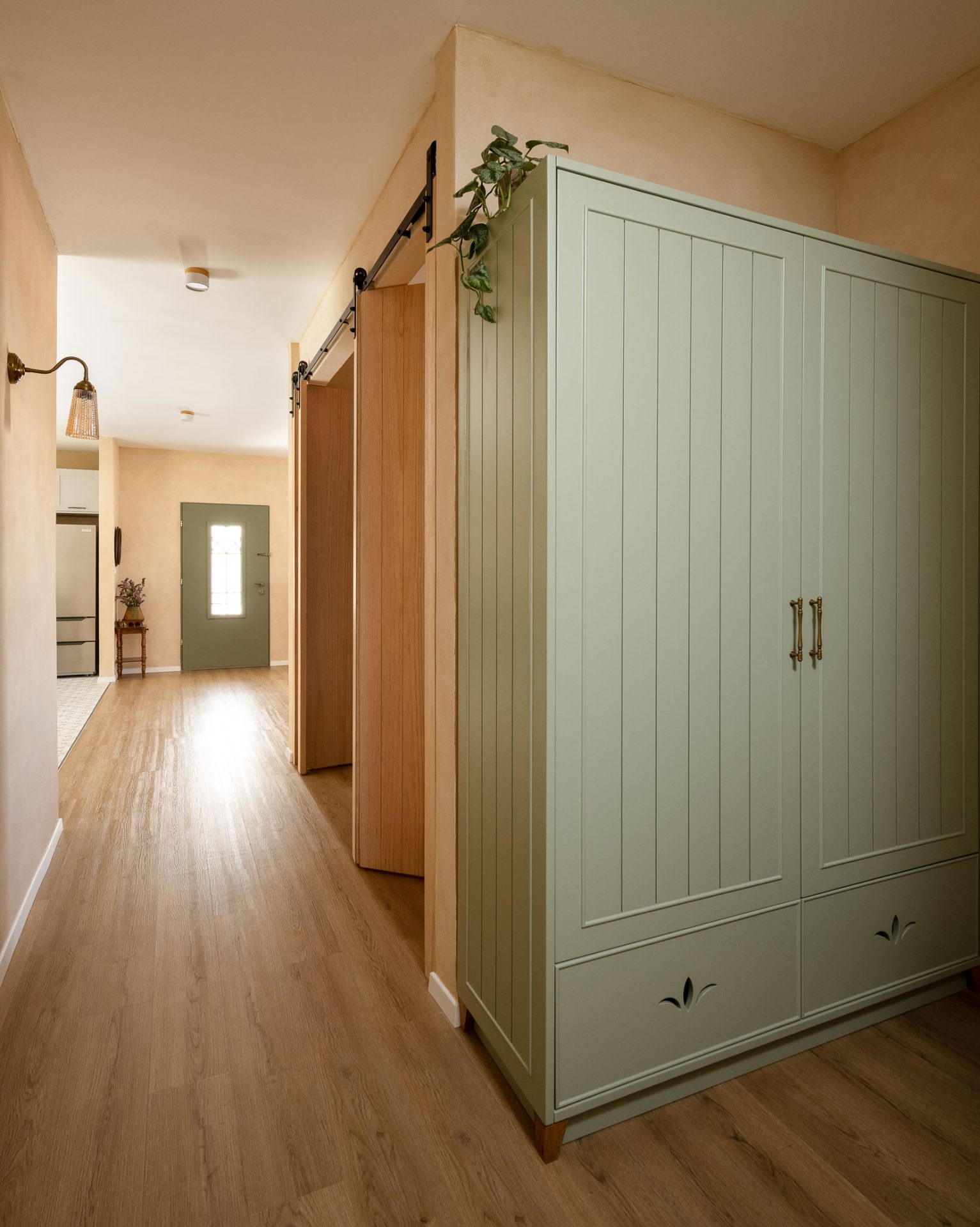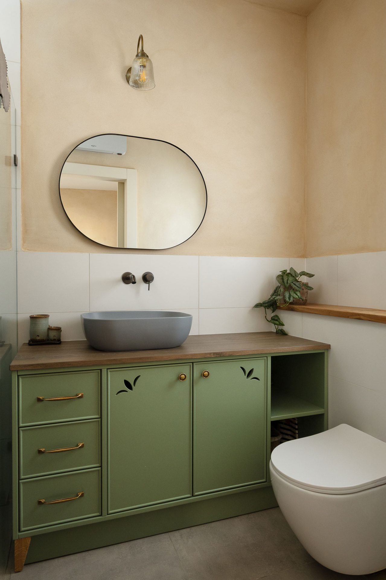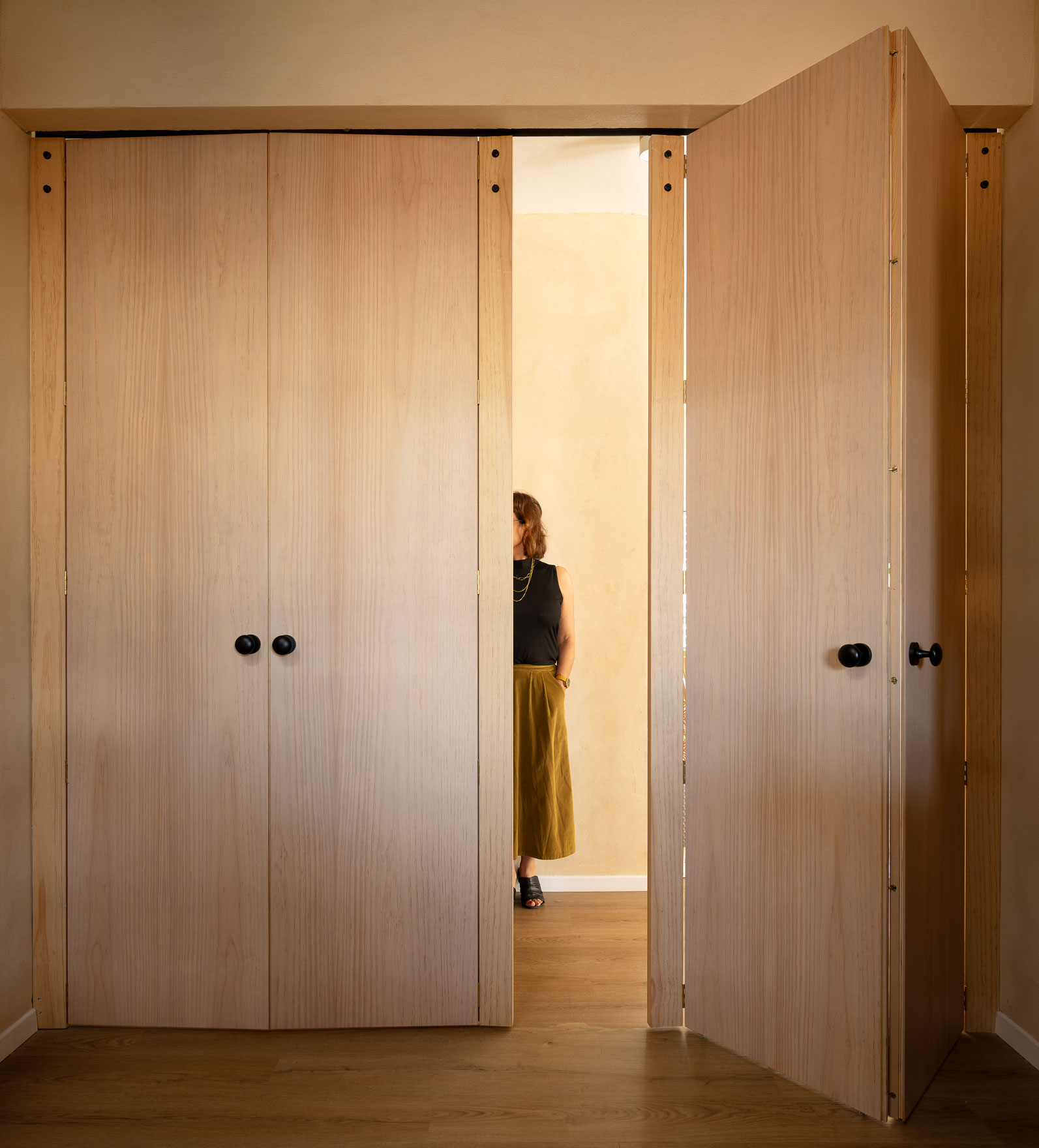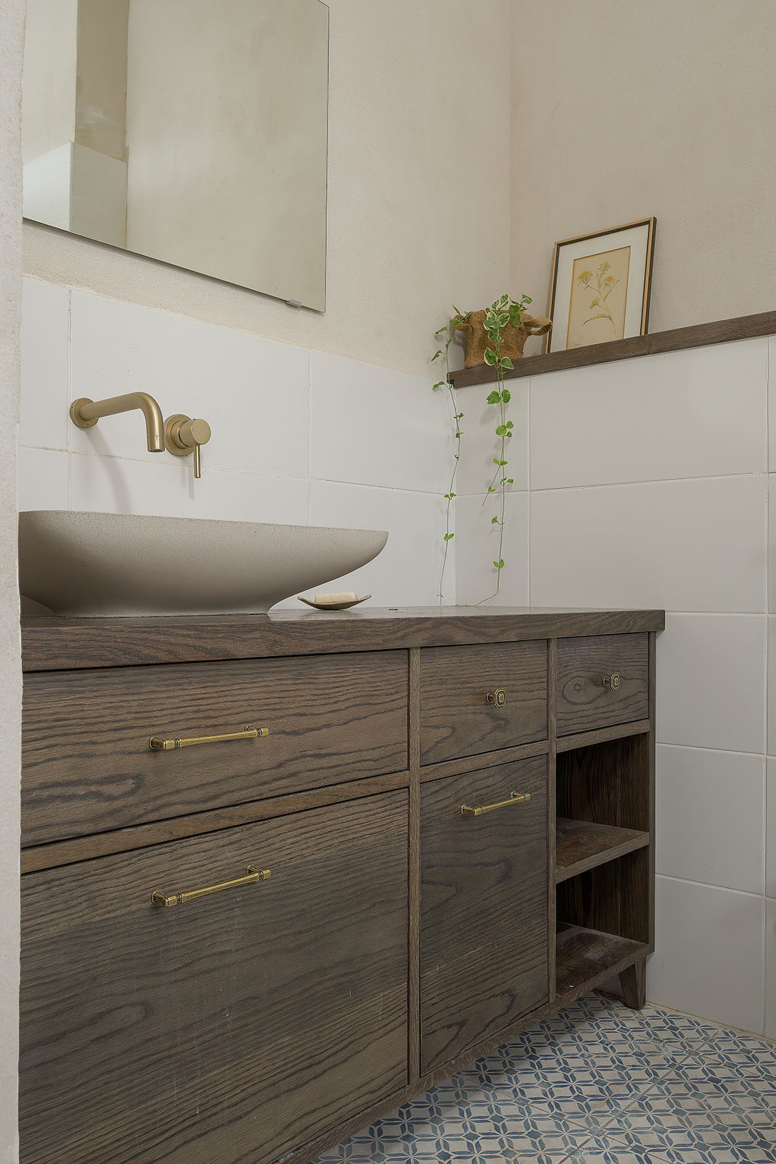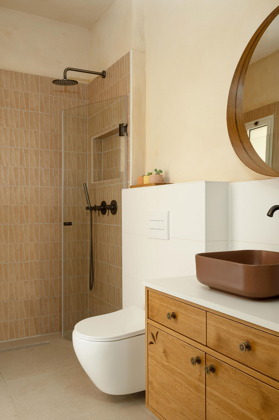 טיח מנראלי, נגיעות עץ חמות ופרופורציות מאוזנות יוצרים חלל שנוכח בשקט בלי להעמיס.