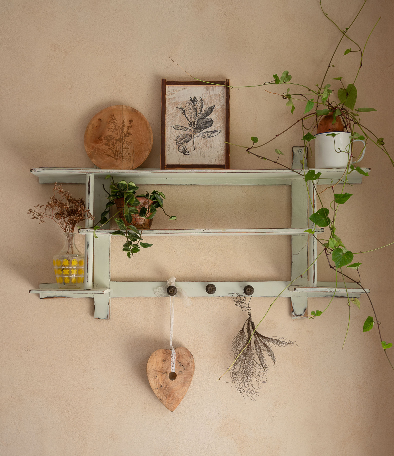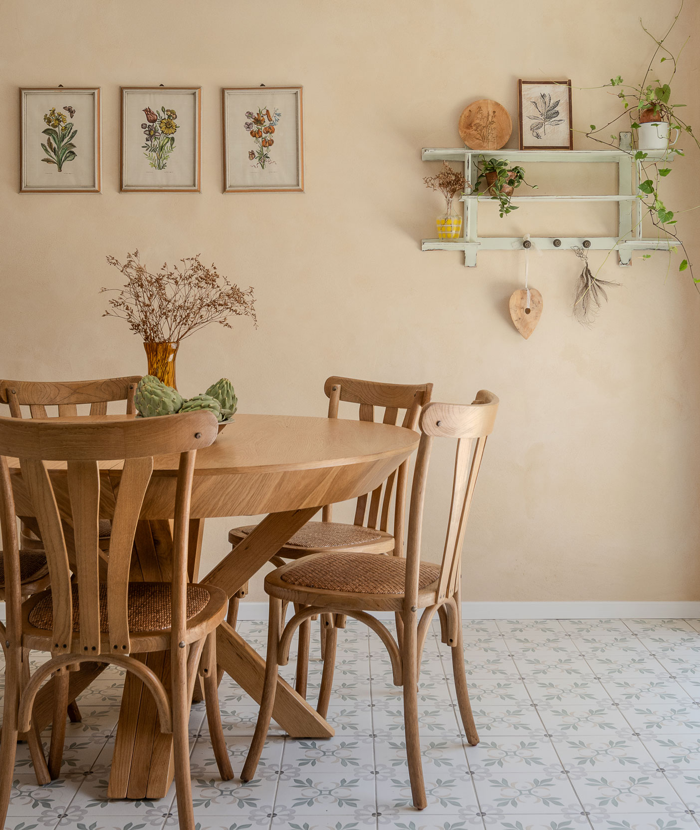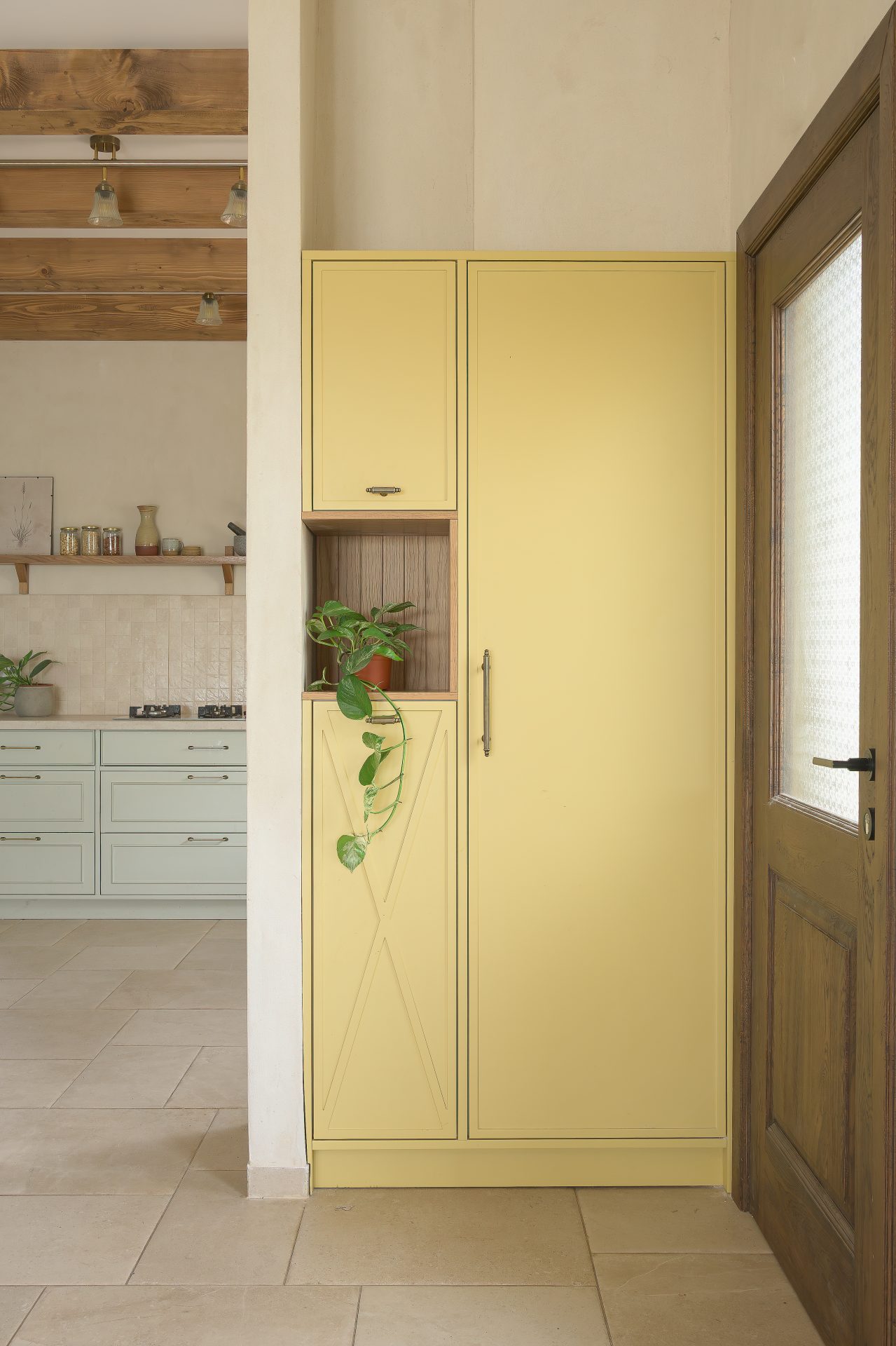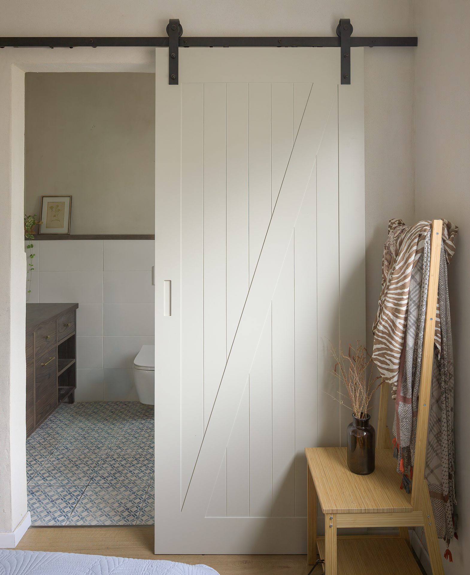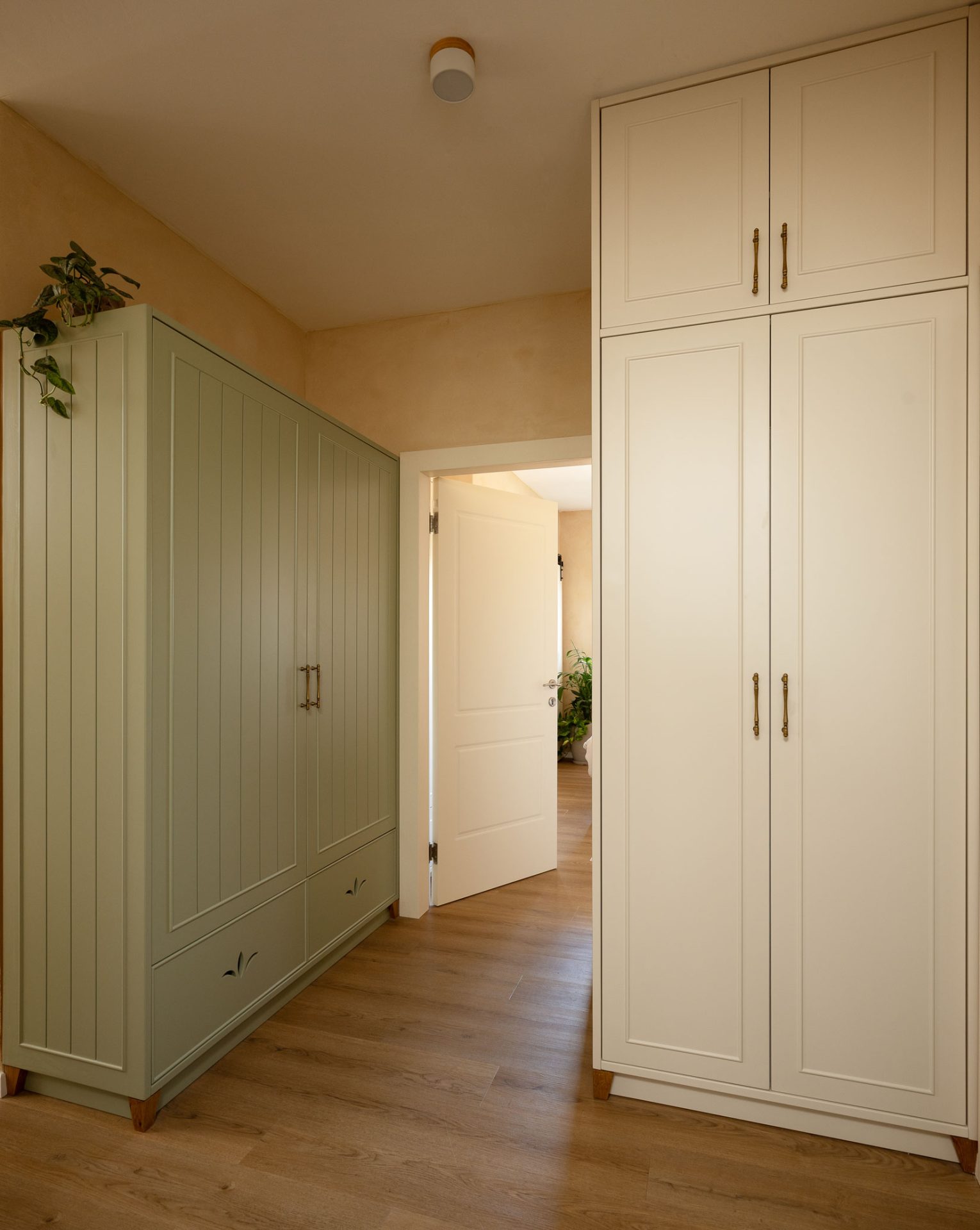 טיח מנראלי, נגיעות עץ חמות ופרופורציות מאוזנות יוצרים חלל שנוכח בשקט בלי להעמיס.